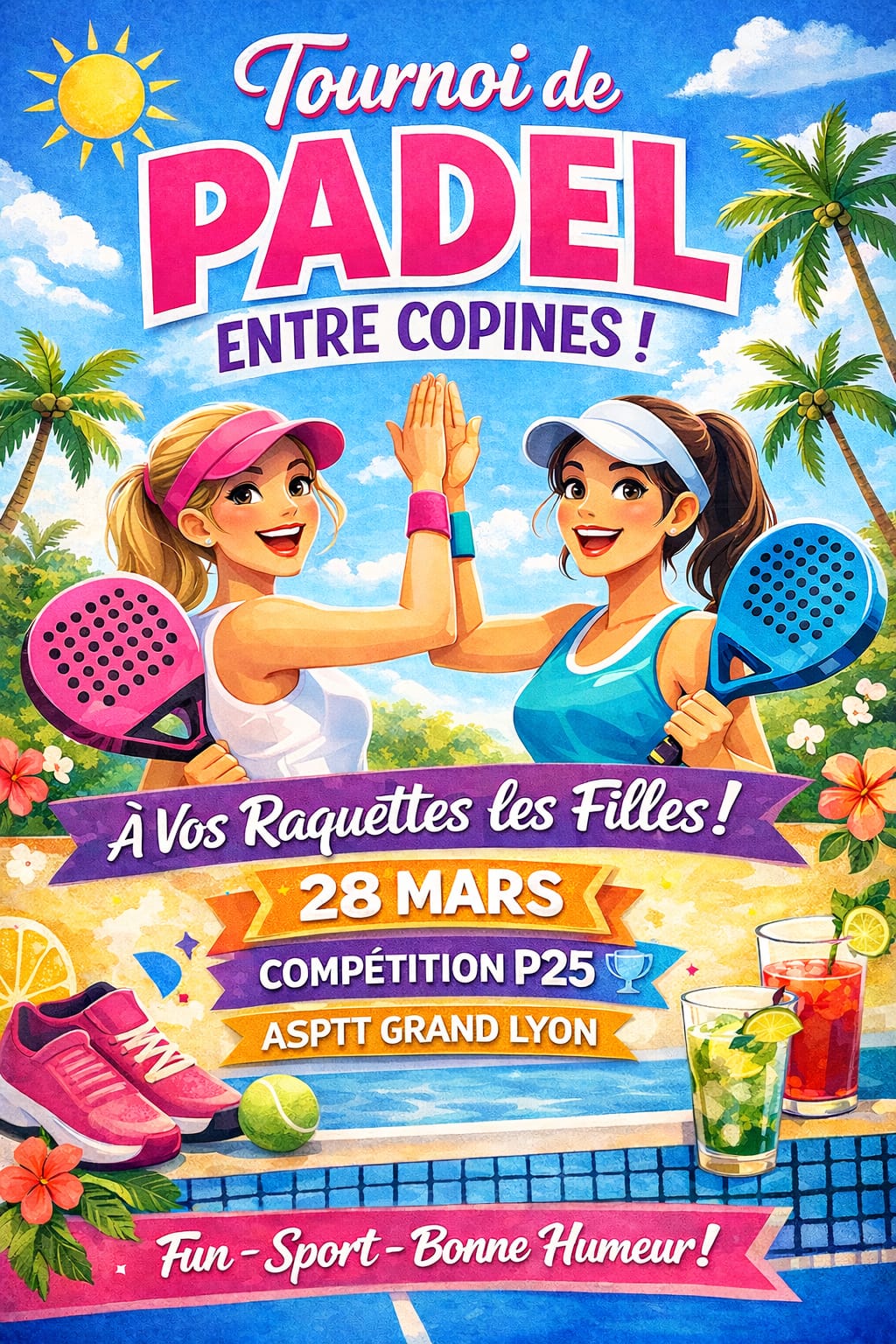 Le samedi 28 mars 2026, l'ASPTT organise son tournoi débutantes P25 "Pad'elles". Tournoi de double féminin. Inscription uniquement par email: asptt-lyon-tennis@wanadoo.fr Tarif: 20 euros / participante -