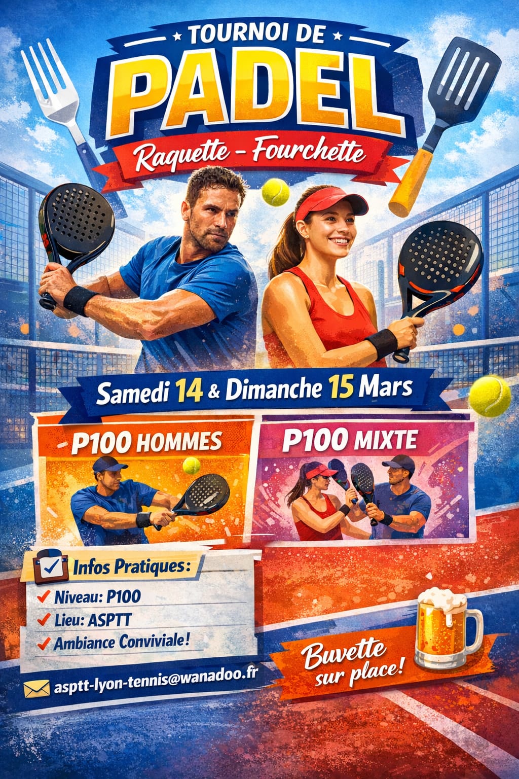 Le Week-end du 14/15 Mars 2026, l'ASPTT Grand Lyon Tennis/Padel organise 2 épreuves de Padel P100 : P100 MessieursP100 Mixte Inscription uniquement par email : asptt-lyon-tennis@wanadoo.fr Tarif: 20 euros / participant / épreuve -