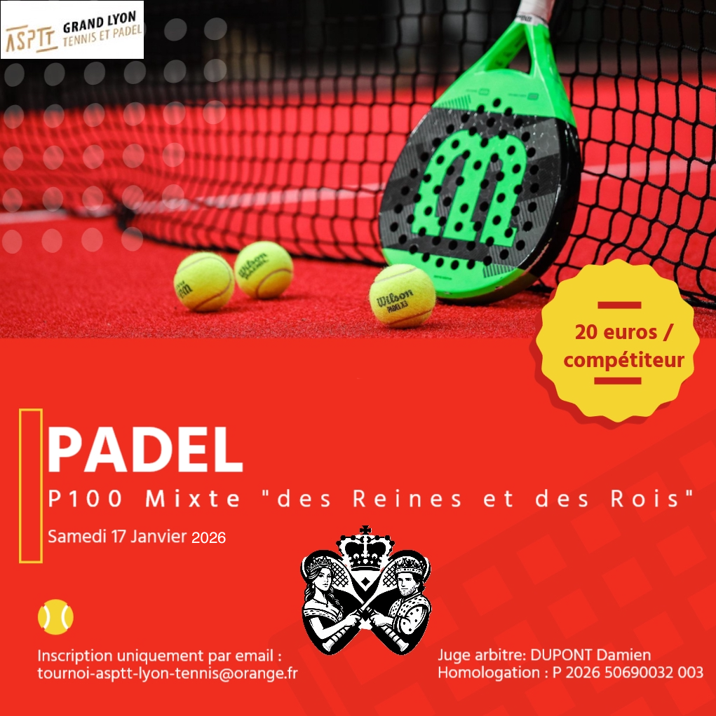 L’ASPTT organise son traditionnel tournoi mixte des reines et des rois le 17 Janvier 2026. Inscription uniquement pour email : tournoi-asptt-lyon-tennis@orange.fr Tarif: 20 euros / compétiteur